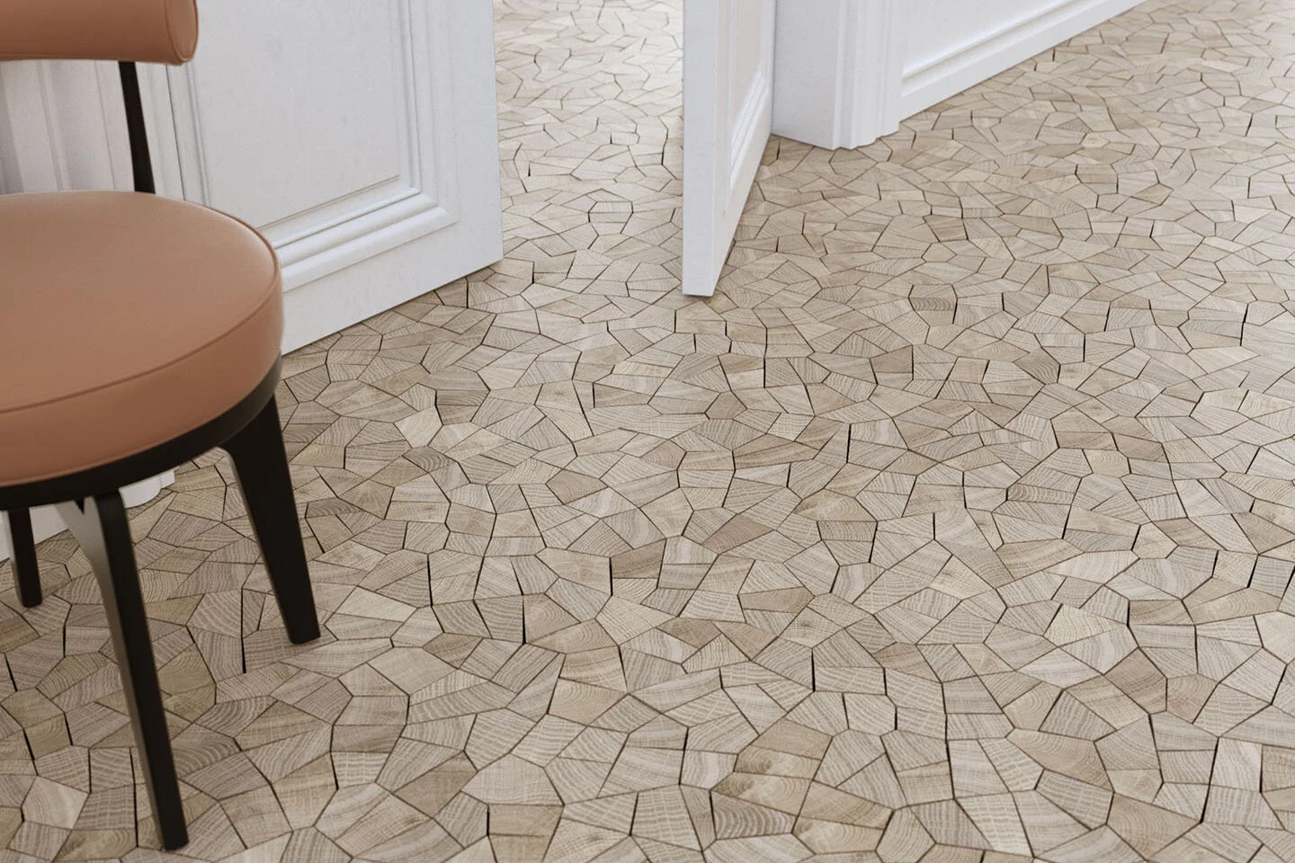 The Opus Collection is a unique handmade wooden surface that comes completely preassembled. Opus is an organic endless pattern obtained with just one tile. Inspired by mosaico in Venice during ancient times, it’s hidden repetition allows for an easy multi-directional application, ready to install tile by tile with seamless connection.