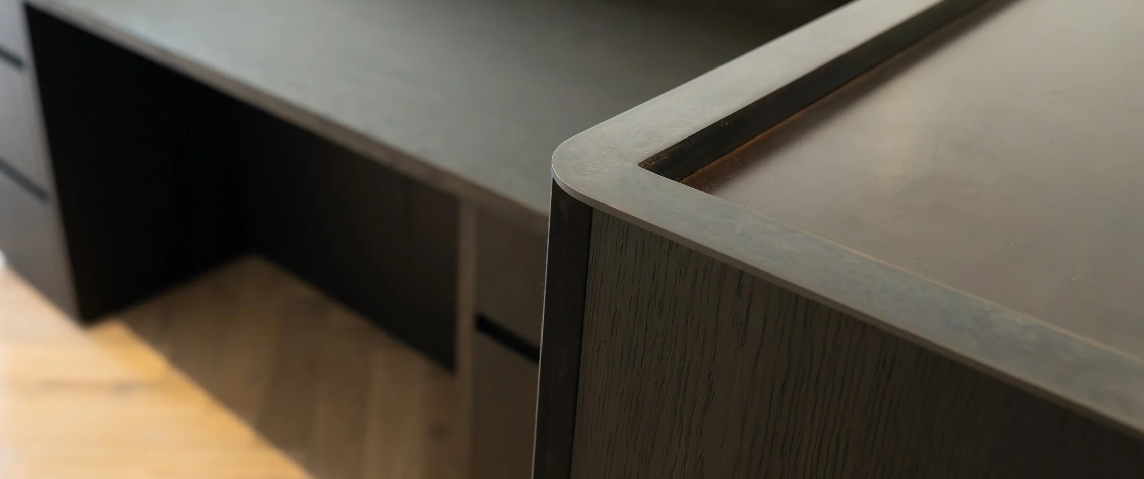 The reception desk is the first thing you see when you step out of the lift – and it’s designed to behave more like a piece of sculpture than an item of office furniture. Spanning around three metres, the desk is formed in dark-stained oak with a blackened steel structure, giving it a commanding presence while still reading as refined and crafted.